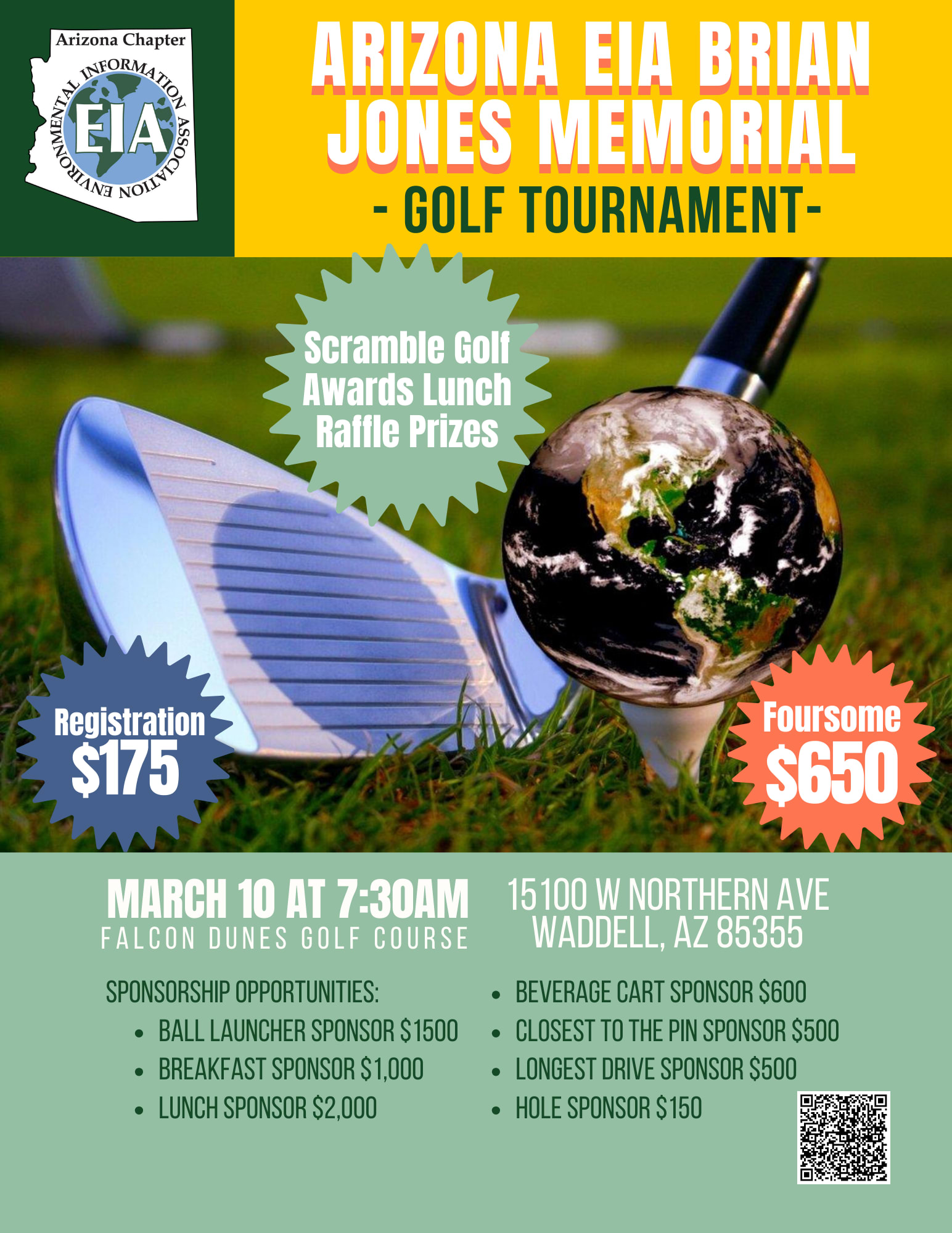 The Arizona Chapter of the EIA is proud to announce the 2026 Brian Jones Golf Tournament on March 10 at Falcon Dunes Golf Course in Waddell, Arizona with a 7:30 am shotgun start. The tournament will include 18 holes of scramble golf, an awards banquet with lunch, and a raffle and a course beverage cart that Brian Jones would toast to! You do NOT want to miss this outstanding annual event, benefiting the Arizona EIA Chapter and supporting the Arizona environmental health and safety industry. Individual registration is $175 and foursome registration is $650. Interested in sponsoring? We have some outstanding sponsorship opportunities that start at just $150.