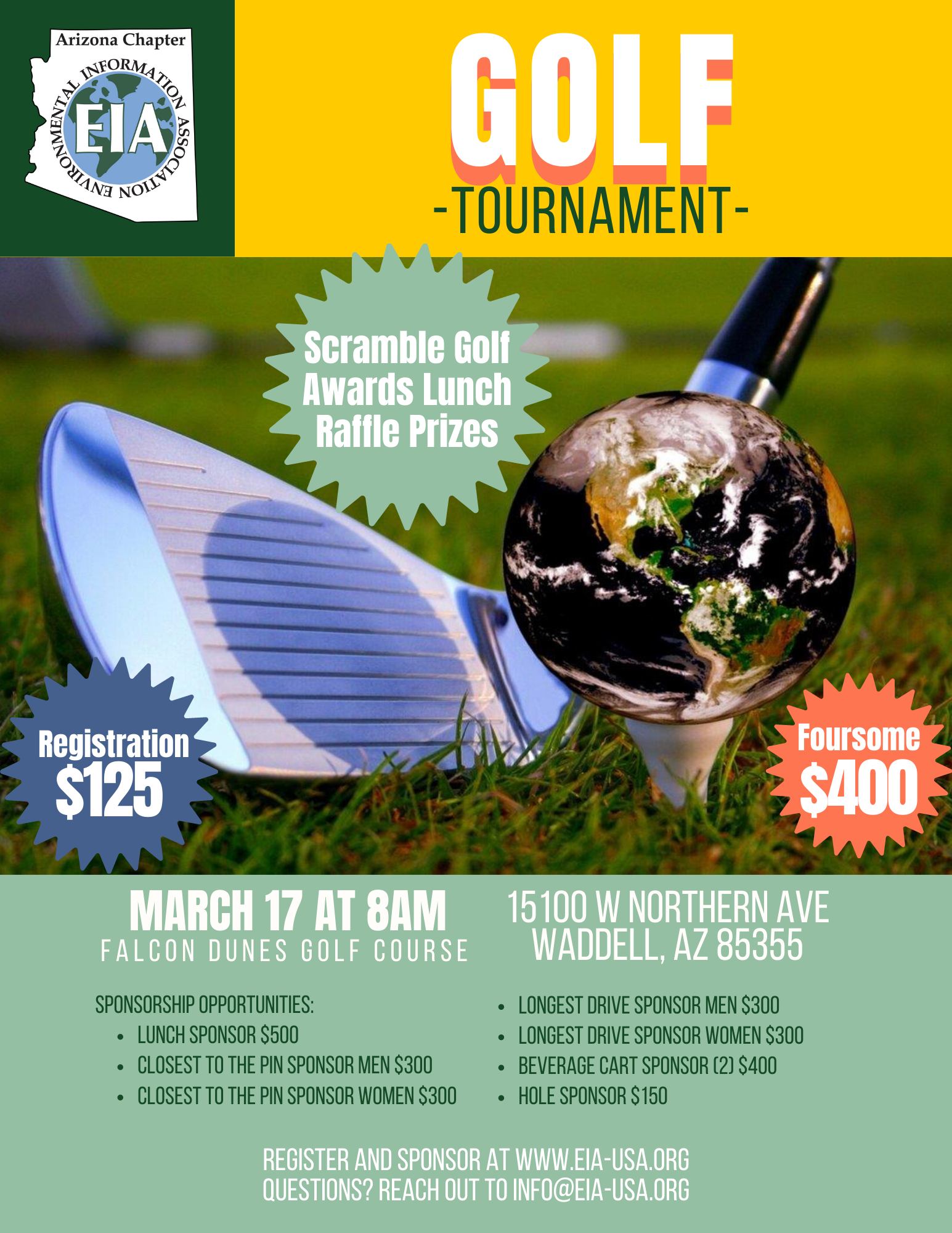The Arizona Chapter of the EIA is proud to announce the 6th Annual Golf Tournament at Falcon Dunes Golf Course. The tournament will include 18 holes of scramble golf, an awards banquet with lunch, a raffle, and all of the fun you can handle! You do NOT want to miss this outstanding annual event, benefiting the Arizona EIA Chapter, supporting the Arizona environmental health and safety industry. Individual registration is $125 and foursome registration is $400. Interested in sponsoring? We have some outstanding sponsorship opportunities that start at just $150. Need more information? Email krutt@eia-usa.org!